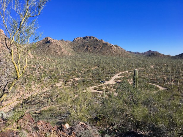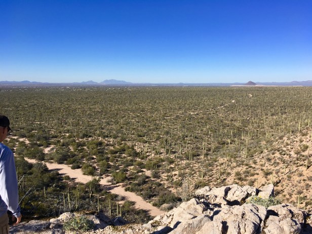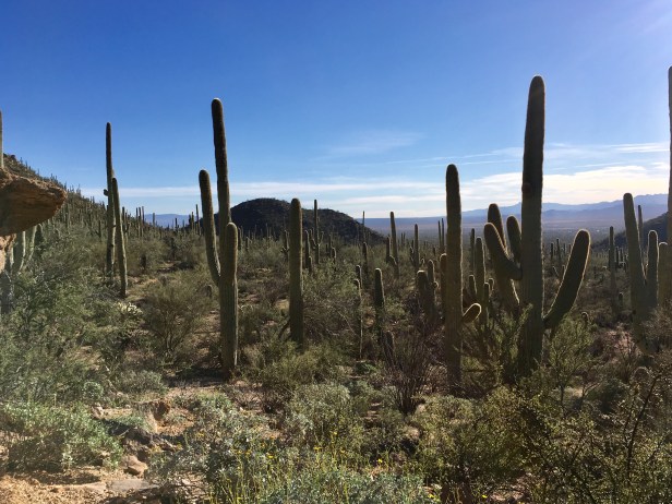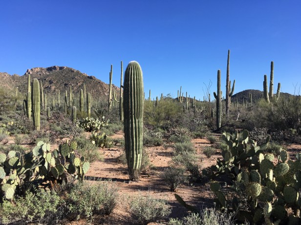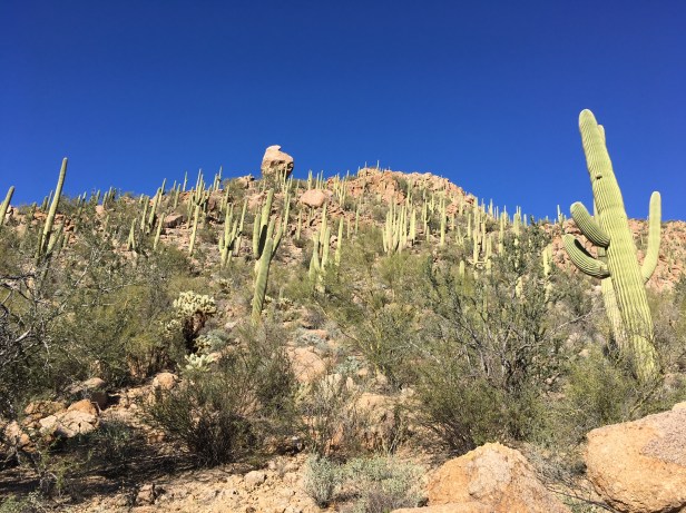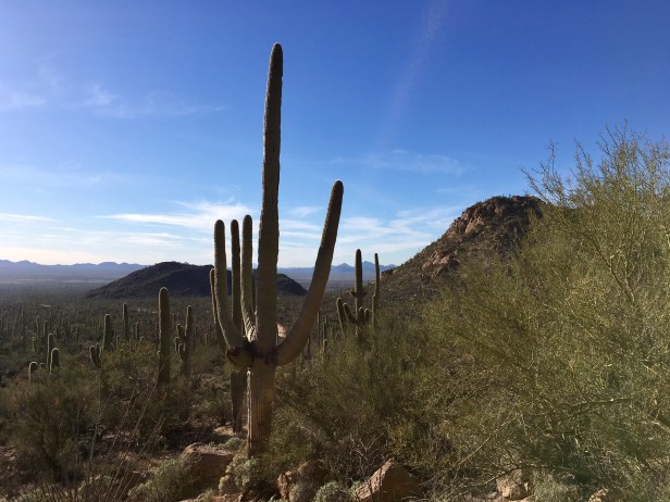 We also hiked ~5 miles along the Hugh Norris trail and continued to be amazed by the large number of flowering plants such as Ochotillo, Cholla, Prickly Pear, and Barrel Cactus that thrive in the beautiful Sonoran desert. One of my favorites was the abundant Palo Verde tree which has bright green bark to match its small green leaves. This tree is actually able to use its green bark for photosynthesis when it drops leaves during the dry, hot summers. Our national parks are truly a treasure that all of us must support and preserve for future generations of Americans. Check out these additional photos from Saguaro National Park (we loved this place)…
