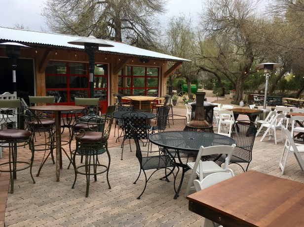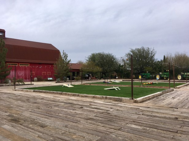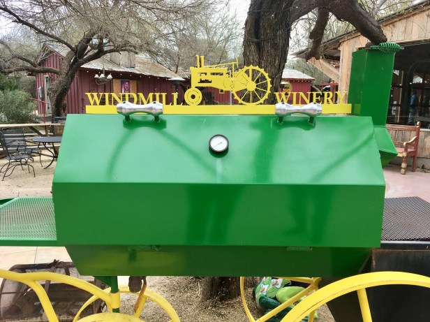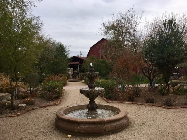 Our next destination is an RV park in Apache Junction northeast of Phoenix but Bonnie had scheduled a free overnight stop at Windmill Winery which is a Harvest Host site outside of Florence, AZ. The winery was an old farm whose two large red barns had been converted into reception halls. The winery staff was very busy setting up for two wedding events but the manager still found time to welcome us and offer access to their grounds. I This winery had ornate gardens, a lake, and large outdoor patio area where people could taste wine, listen to live music, and eat local BBQ. This place was fantastic !!! We hung out with two other couples camped there and spent the evening talking by a roaring fire. We really enjoyed spending time with Jack & Margaret from Sacramento, CA and Bob & Nancy from St. Mary’s, Canada. Here are a few photos from our visit to the winery….