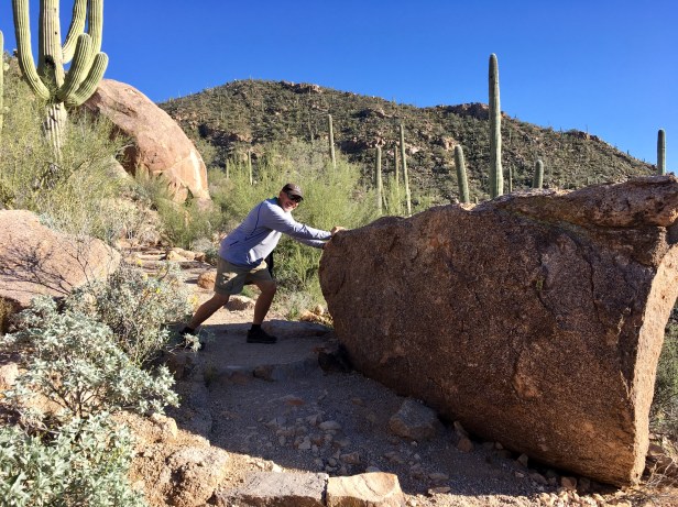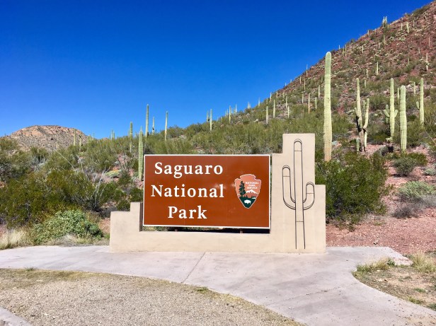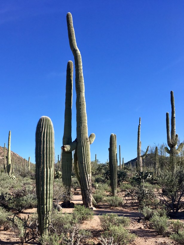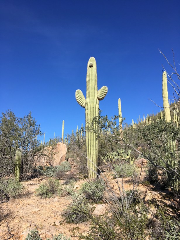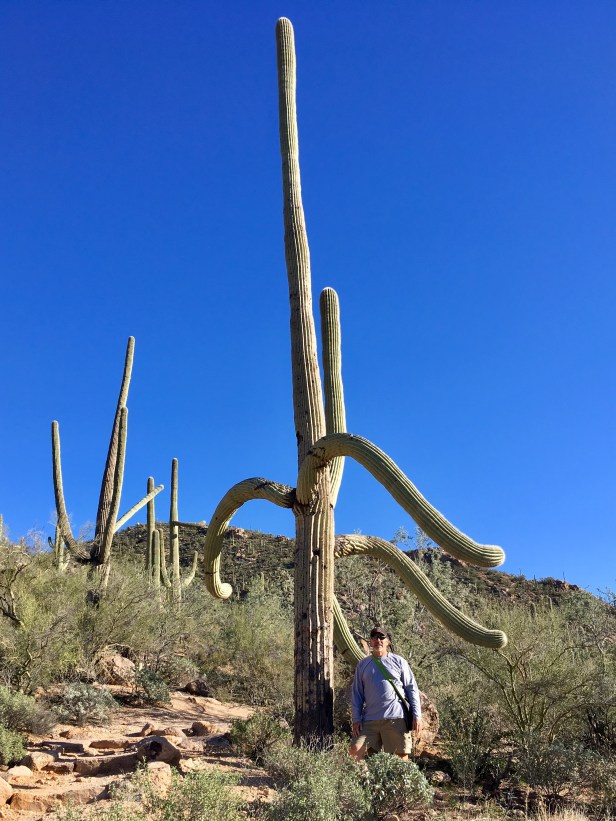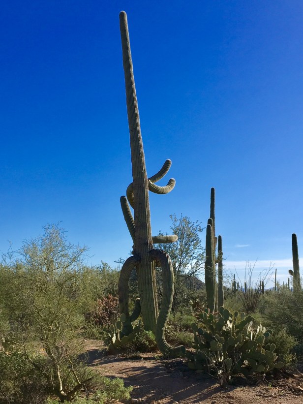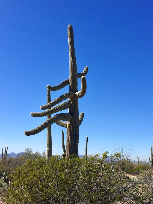 The giant saguaro cactus is a well-known symbol of the American west and only grows in certain southwestern regions of our country. The Saguaro National Park spans both eastern and western mountain ranges around Tucson and was created to protect these magnificent cacti and the rare desert mountain habitat that they live in. We were very excited to visit this park as it was amazing to see a forest of enormous cactus dotting the landscape all around us. Each cactus had its own unique size and shape based on the number of arms it had developed over many decades of growth. Check out some examples of the many Saguaros that Bonnie snapped pics of….she added some captions on the ones with personality!