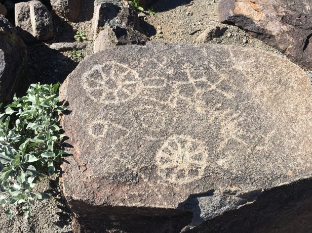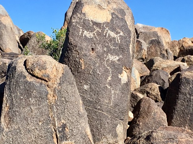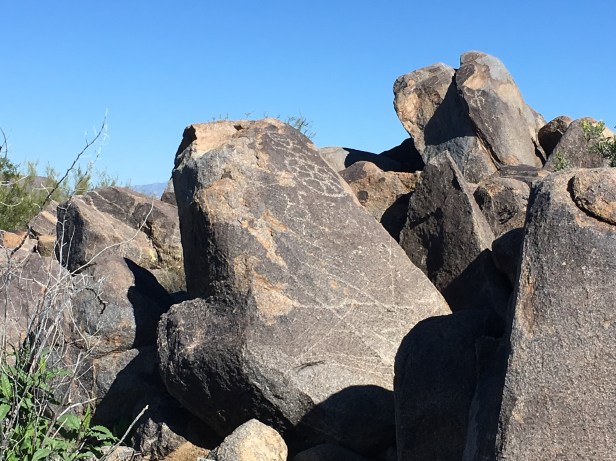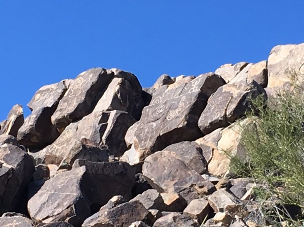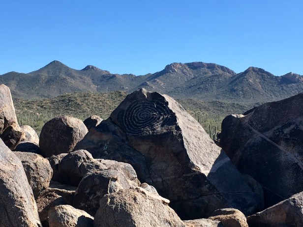The following day, we hiked the short but interesting Signal Hill trail at Saguaro National Park which led us to a large mound where pre-historic Native Americans, called the Hohokam, carved petroglyphs into the rocks there. The Hohokam were farmers, gatherers, and hunters who lived in the river valleys and deserts of southern Arizona from about 450 to 1450 AD. The petroglyphs were symbols from their language that they left us as a reminder of their culture. Here are some shots from the Signal Hill trail and pics of Hohokam petroglyphs at the western side of Saguaro National Park…