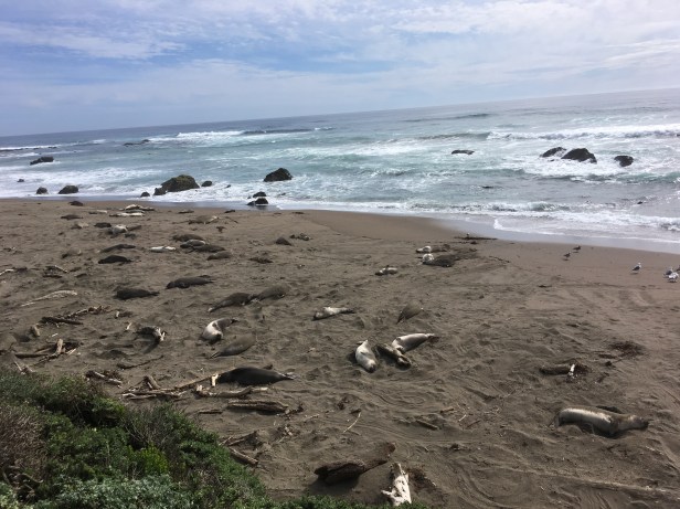 Bonnie was very successful at finding sea otters swimming in the ocean surf so I started to call her the “Sea Otter Spotter”. Sea Otters have made an incredible come back in the area after being hunted to near extinction on the west coast for their fur. We watched mother elephant seals and their babies nurse while sunning themselves on beaches located 4 miles north of Hearst Castle. These beaches are critical seal habitat, called rookeries, because thousands of elephant seals come back every year to mate, give birth, and raise newborn pups there. Here are a couple of interesting elephant seal facts you may be interested in: